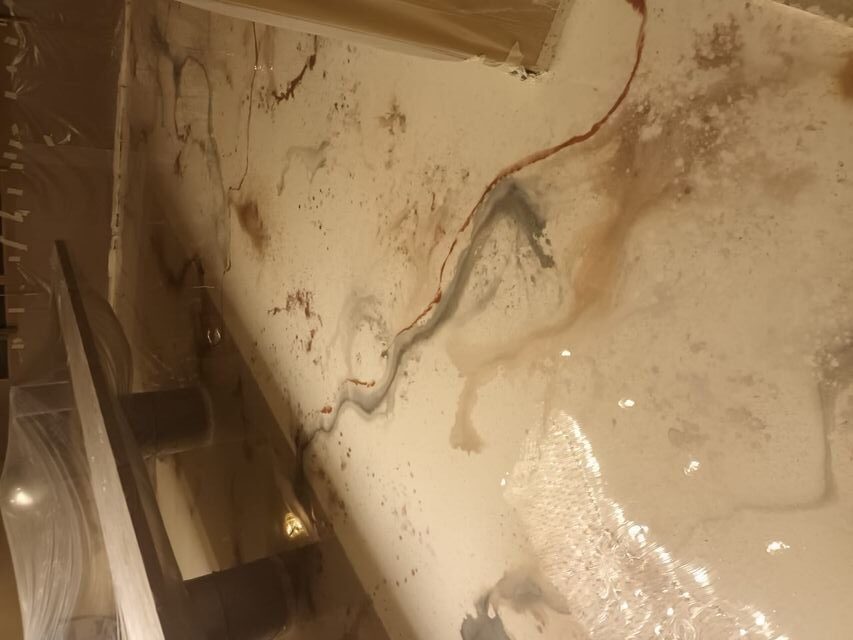 Once mixed, we use a plastic watering can to distribute the solution evenly over the area, and wait 10-15 minutes to create micro abrasions. Then rinse off the floor and Let it dry overnight.